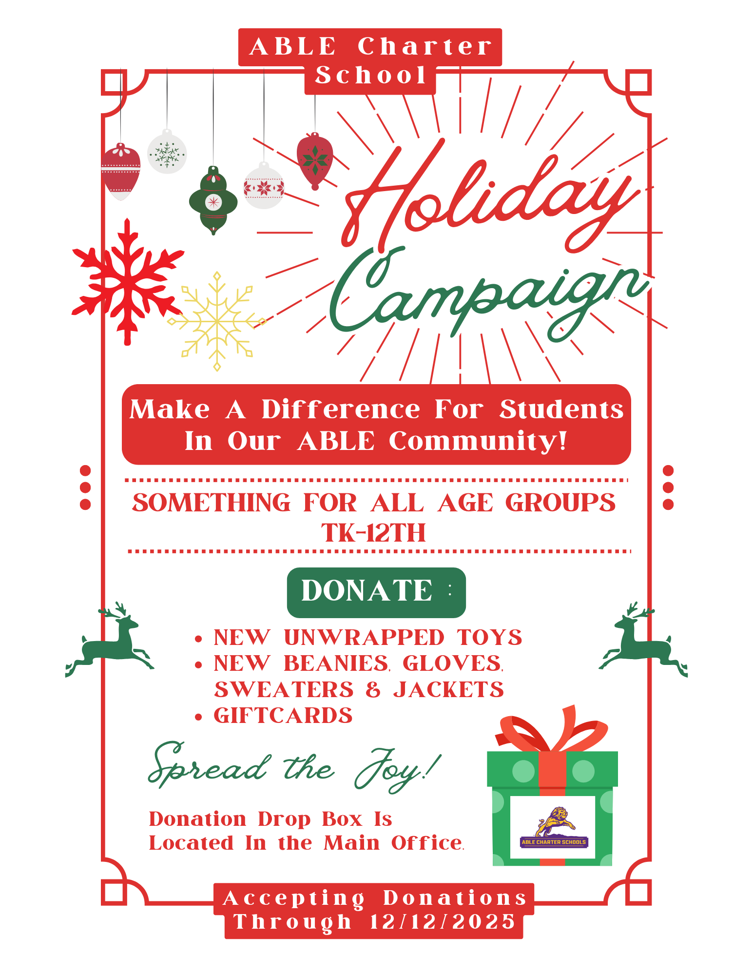 ABLE's Holiday Campaign Make a difference for students in our ABLE community.Donate something for all age groups TK-12 for detail click for details